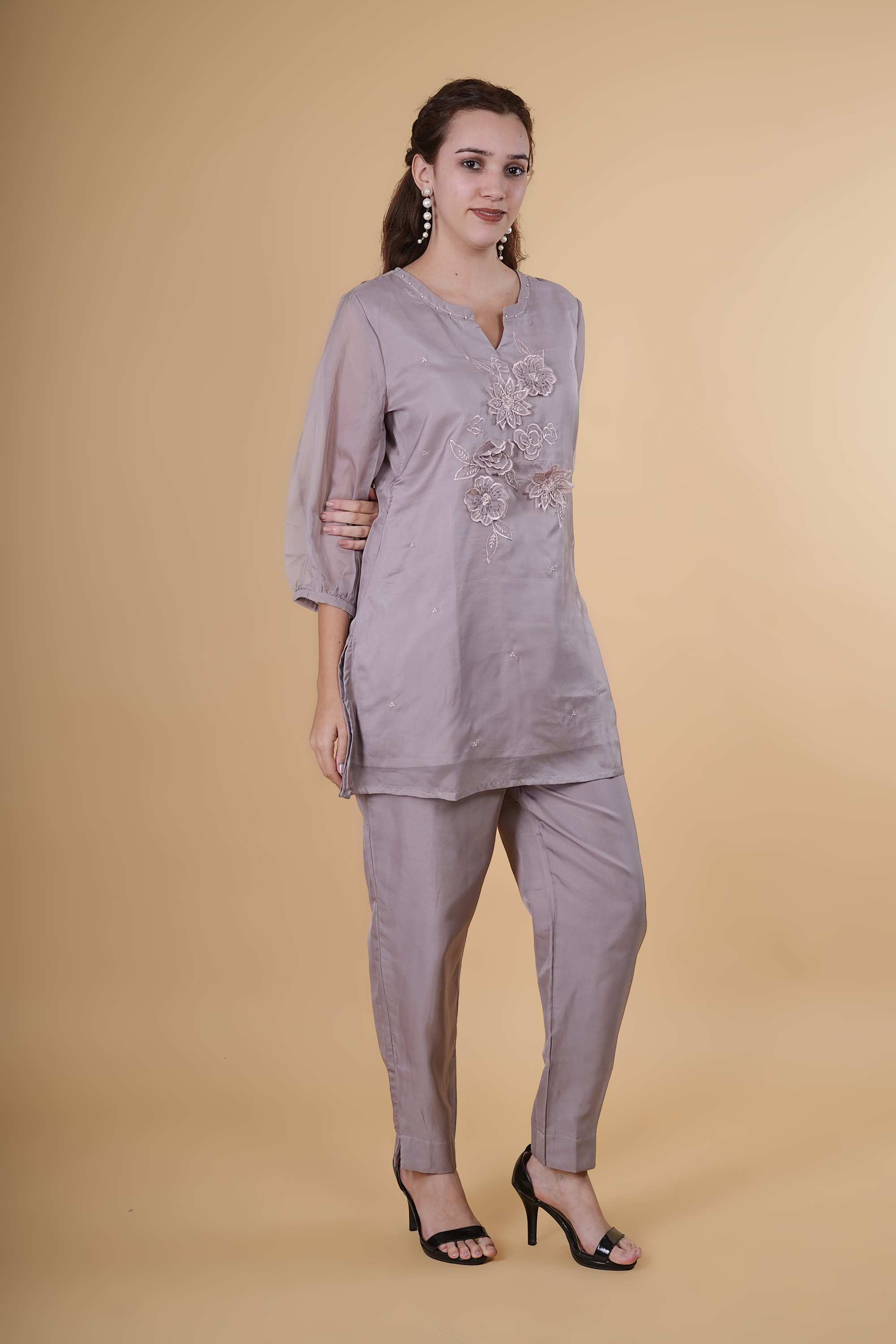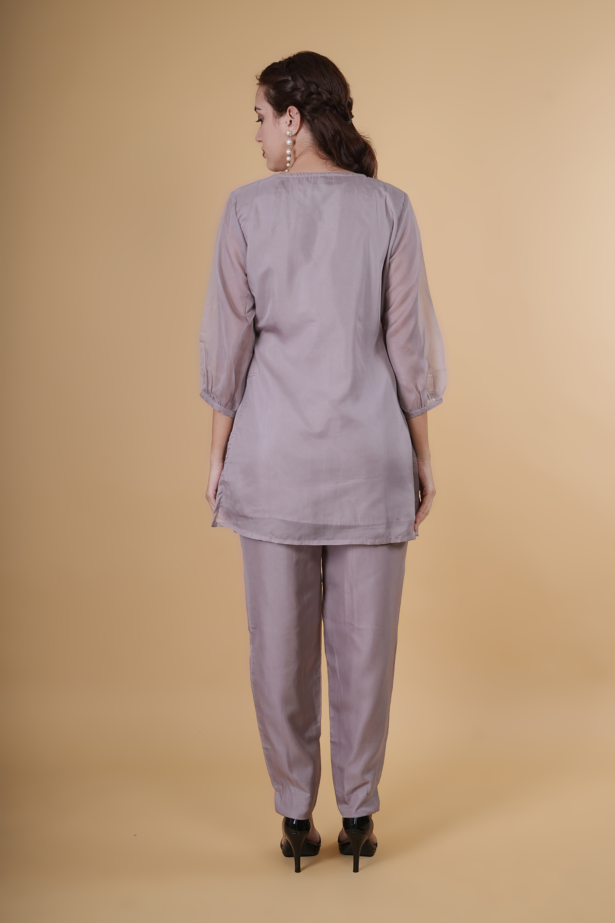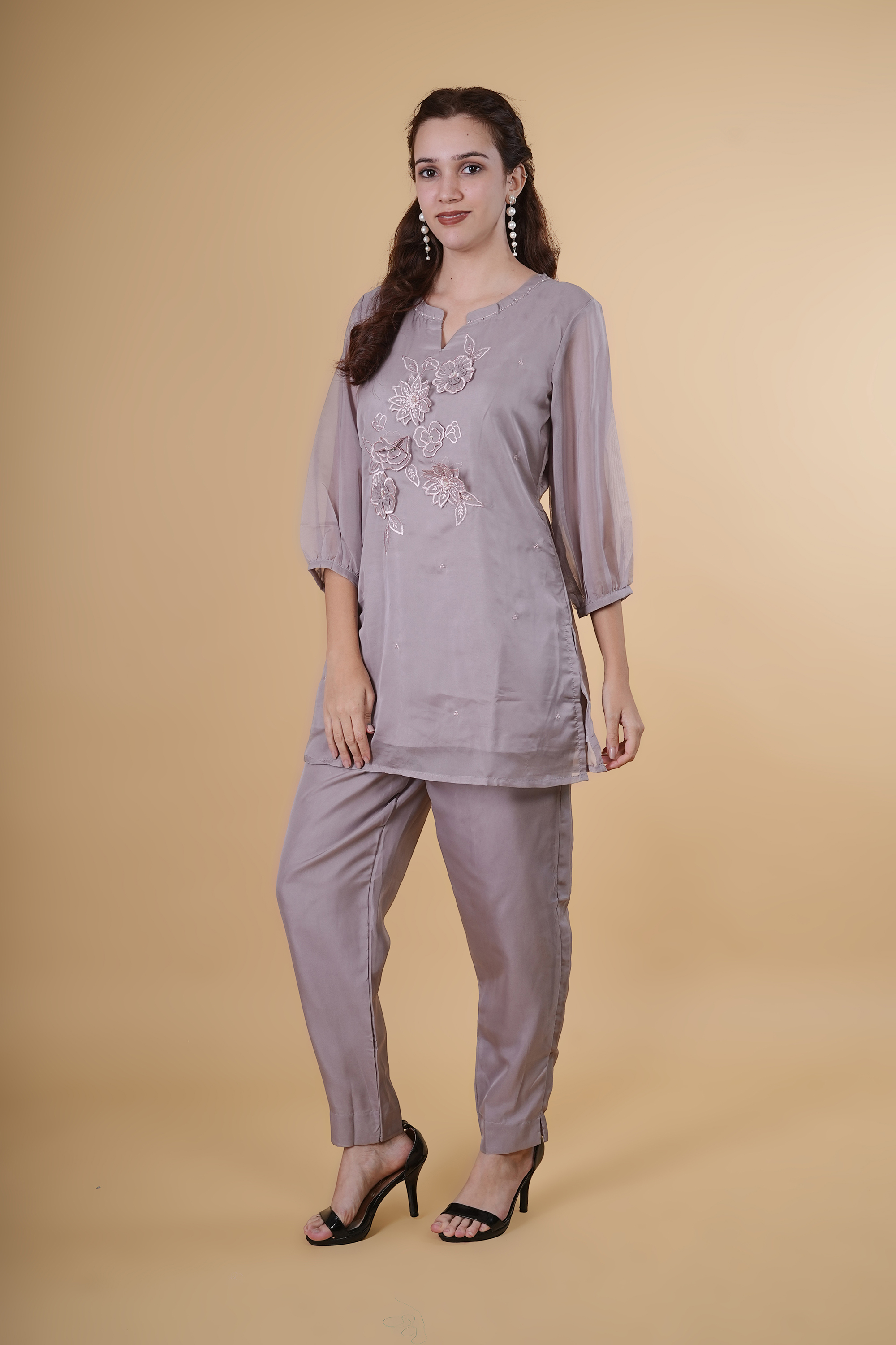 A glossy grape co-ord set for women typically refers to a coordinated outfit that comes in a rich, deep purple or grape color, made from a shiny or glossy fabric like satin, silk, or a polyester blend. Color Shade: Grape or deep purple, which is a versatile, flattering color that works for both daytime and evening events. Finish: Glossy or satin-like finish, providing a sleek, polished look. Top Style: Options include a cropped top, bralette, or a fitted blouse. Some popular designs include off-shoulder, halter neck, or V-neck tops for added elegance. Fabric: Satin, silk, or polyester blends to give the glossy effect. Bottom Style: Matching bottoms can include high-waisted trousers, a pencil skirt, or a flared pant style. The pants may have a relaxed fit, or be more tailored for a chic and modern look. Fabric: Same glossy or satin fabric to keep the set cohesive. Fit: Straight-leg, wide-leg, or skinny-fit pants, or a fitted mini or midi skirt depending on the style. Styling Occasions: Great for night outs, cocktail parties, formal gatherings, or festive occasions where a polished look is desired. Accessories: Pair with gold or silver jewelry, strappy heels or stilettos, and a sleek handbag or clutch to elevate the outfit. A glossy grape co-ord set is perfect for making a statement, offering a refined yet bold look. It's a great choice for occasions that call for a sophisticated, fashionable outfit with a bit of flair.