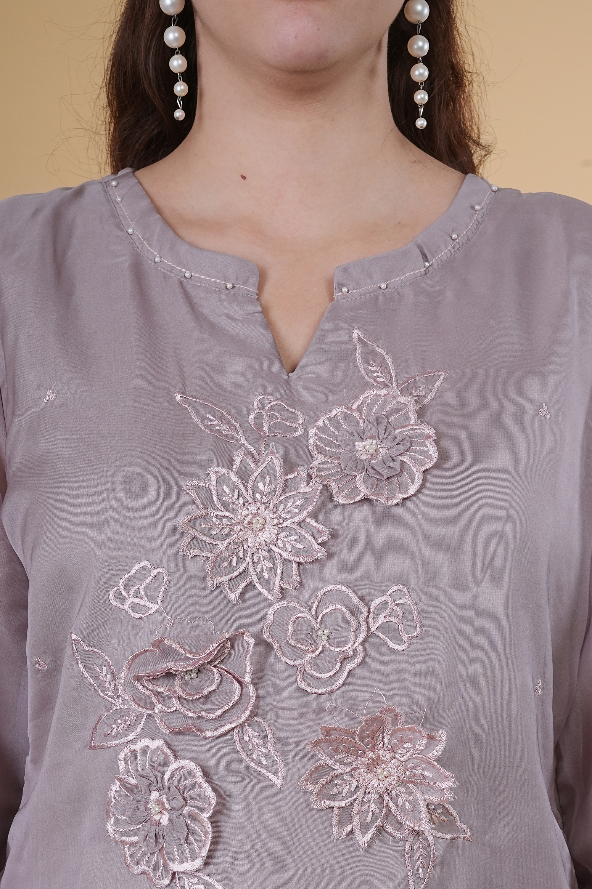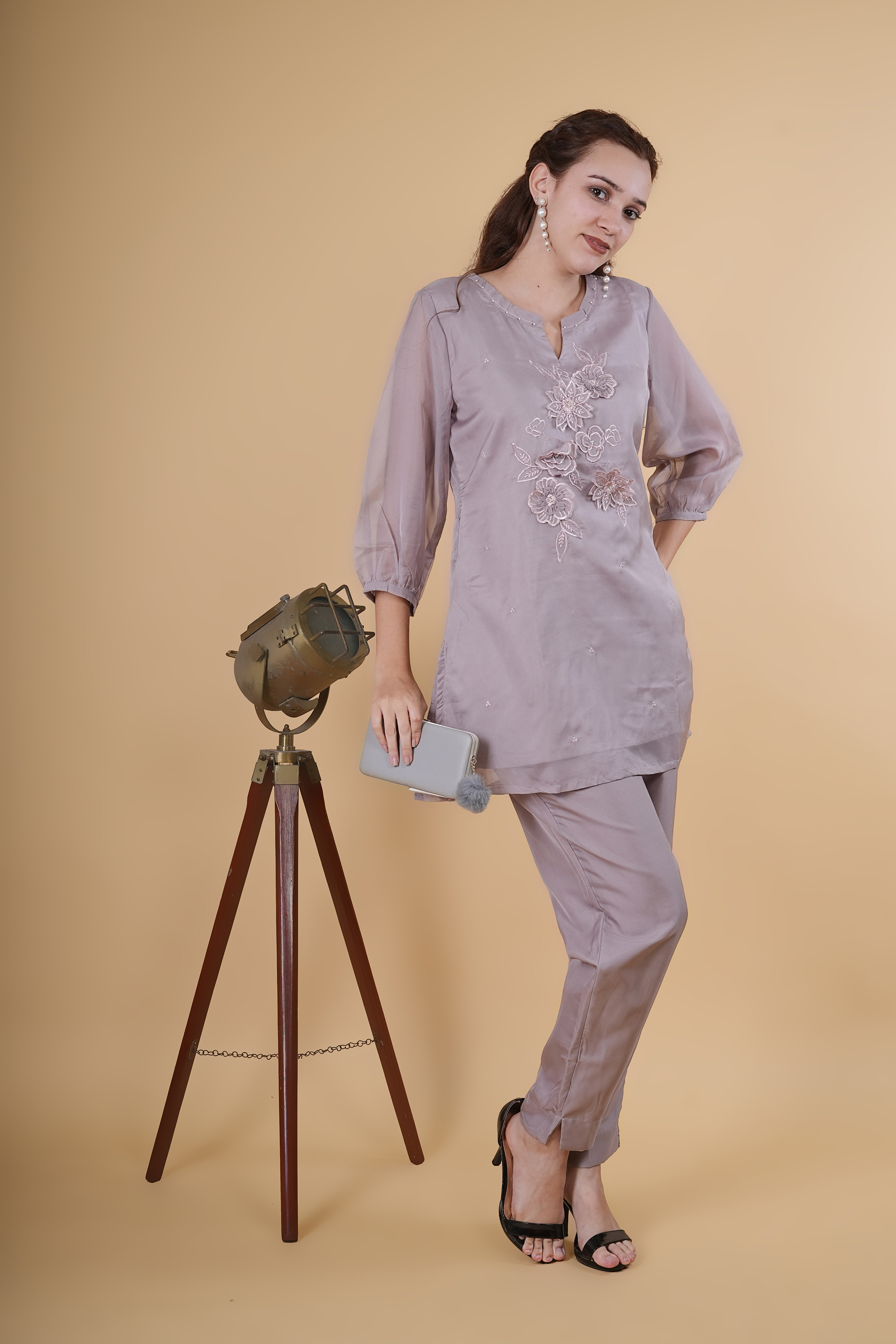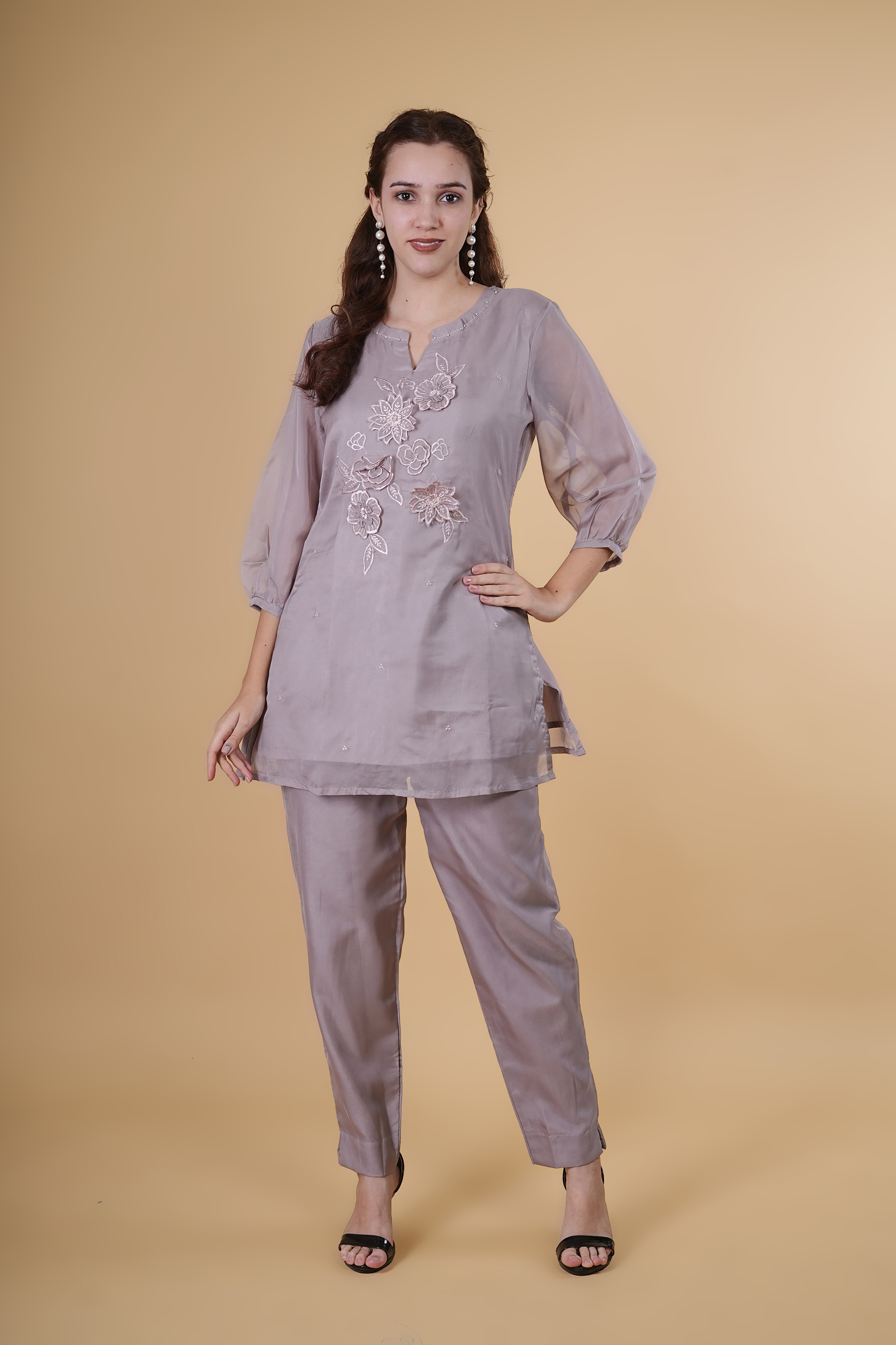 A glossy grape co-ord set for women typically refers to a coordinated outfit that comes in a rich, deep purple or grape color, made from a shiny or glossy fabric like satin, silk, or a polyester blend. Color Shade: Grape or deep purple, which is a versatile, flattering color that works for both daytime and evening events. Finish: Glossy or satin-like finish, providing a sleek, polished look. Top Style: Options include a cropped top, bralette, or a fitted blouse. Some popular designs include off-shoulder, halter neck, or V-neck tops for added elegance. Fabric: Satin, silk, or polyester blends to give the glossy effect. Bottom Style: Matching bottoms can include high-waisted trousers, a pencil skirt, or a flared pant style. The pants may have a relaxed fit, or be more tailored for a chic and modern look. Fabric: Same glossy or satin fabric to keep the set cohesive. Fit: Straight-leg, wide-leg, or skinny-fit pants, or a fitted mini or midi skirt depending on the style. Styling Occasions: Great for night outs, cocktail parties, formal gatherings, or festive occasions where a polished look is desired. Accessories: Pair with gold or silver jewelry, strappy heels or stilettos, and a sleek handbag or clutch to elevate the outfit. A glossy grape co-ord set is perfect for making a statement, offering a refined yet bold look. It's a great choice for occasions that call for a sophisticated, fashionable outfit with a bit of flair.