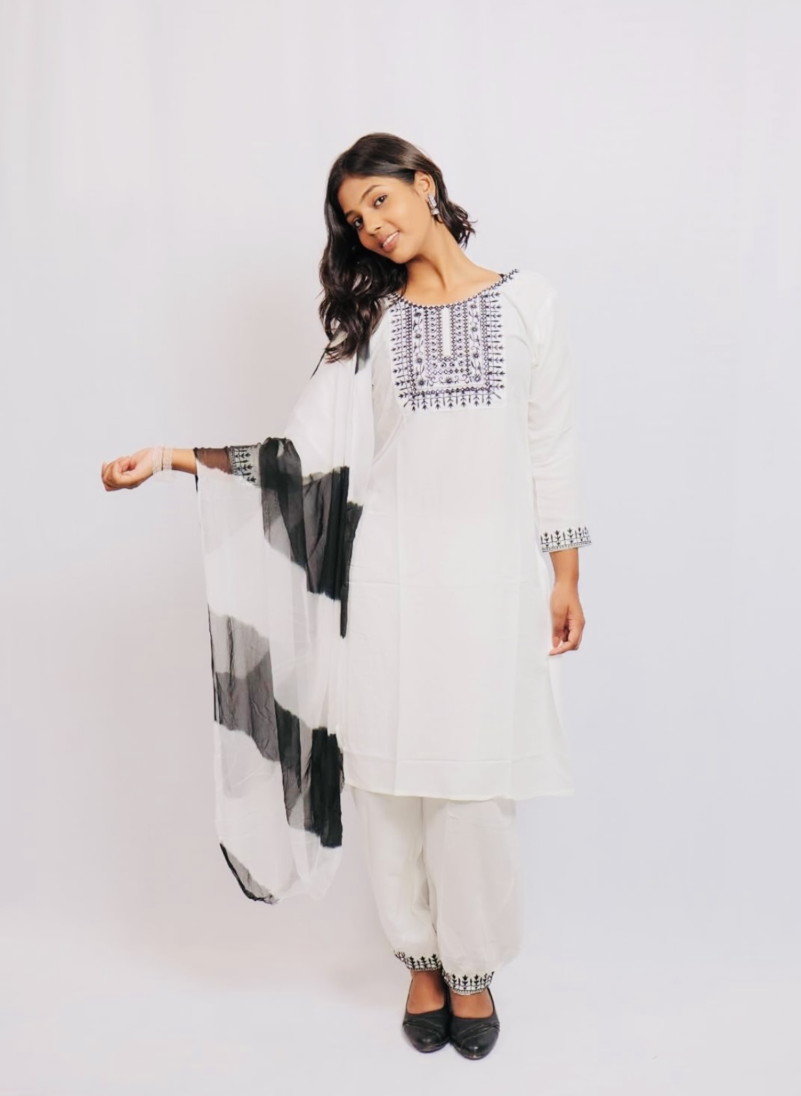 Where comfort meets culture — gracefully. 🌸 Introducing Noor-e-Afghan, an exquisite ensemble that blends tradition with modern simplicity. This white cotton blend suit features a straight-cut kurta paired with a beautifully flared Afghani-style salwar, giving your ethnic wardrobe a timeless refresh. Crafted with a breathable cotton blend, the fabric is lightweight yet structured — perfect for summer days and transitional seasons. The kurta is minimally embellished with fine thread work around the neckline and sleeves, adding a touch of understated elegance. The Afghani salwar steals the spotlight with its voluminous pleats, offering both unmatched comfort and ethnic charm. ✨ Key Highlights: 👗 Kurta Fabric: Premium cotton blend — soft on skin, ideal for all-day wear 👖 Salwar Style: Afghani cut with deep pleats and a comfortable fit 🧵 Design Details: Delicate thread embroidery on neckline and cuffs 🎨 Color: Pristine White – pure, elegant, and easy to accessorize 📏 Fit: Relaxed and flowy silhouette for all body types 📦 Includes: Kurta + Afghani Salwar (Dupatta optional) 💡 Styling Tips: Pair it with oxidized silver jhumkas, bangles, and embroidered juttis for a complete ethnic look. Add a colorful printed dupatta or a solid organza drape for festive flair. Perfect for: Daily wear, small gatherings, temple visits, or ethnic Fridays at work. 🛍️ Why You'll Love It: This set isn’t just about style — it’s about comfort, confidence, and celebrating your roots in a contemporary way. Whether you’re sipping chai on a breezy morning or attending a casual get-together, Noor-e-Afghan makes sure you do it with grace.
