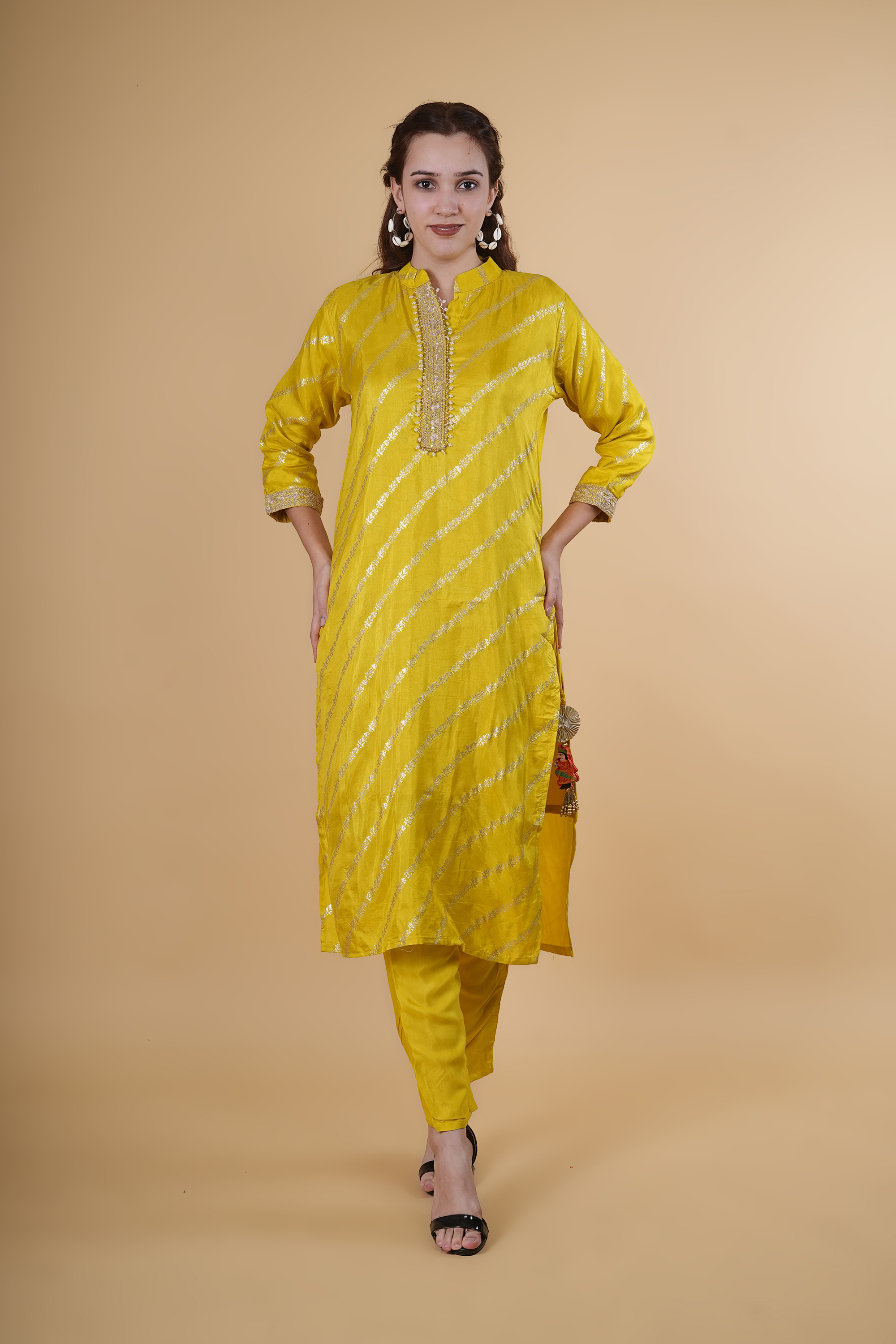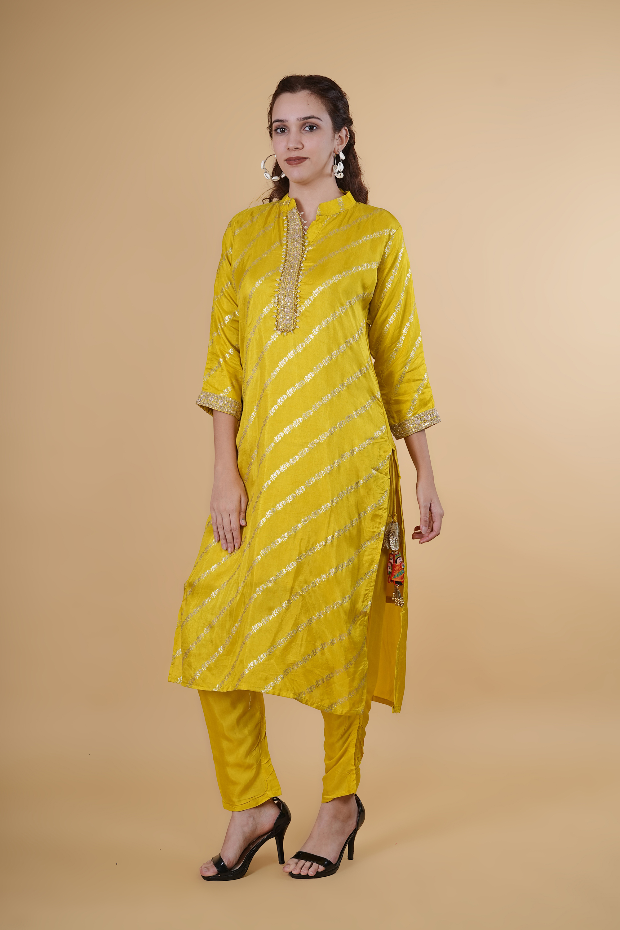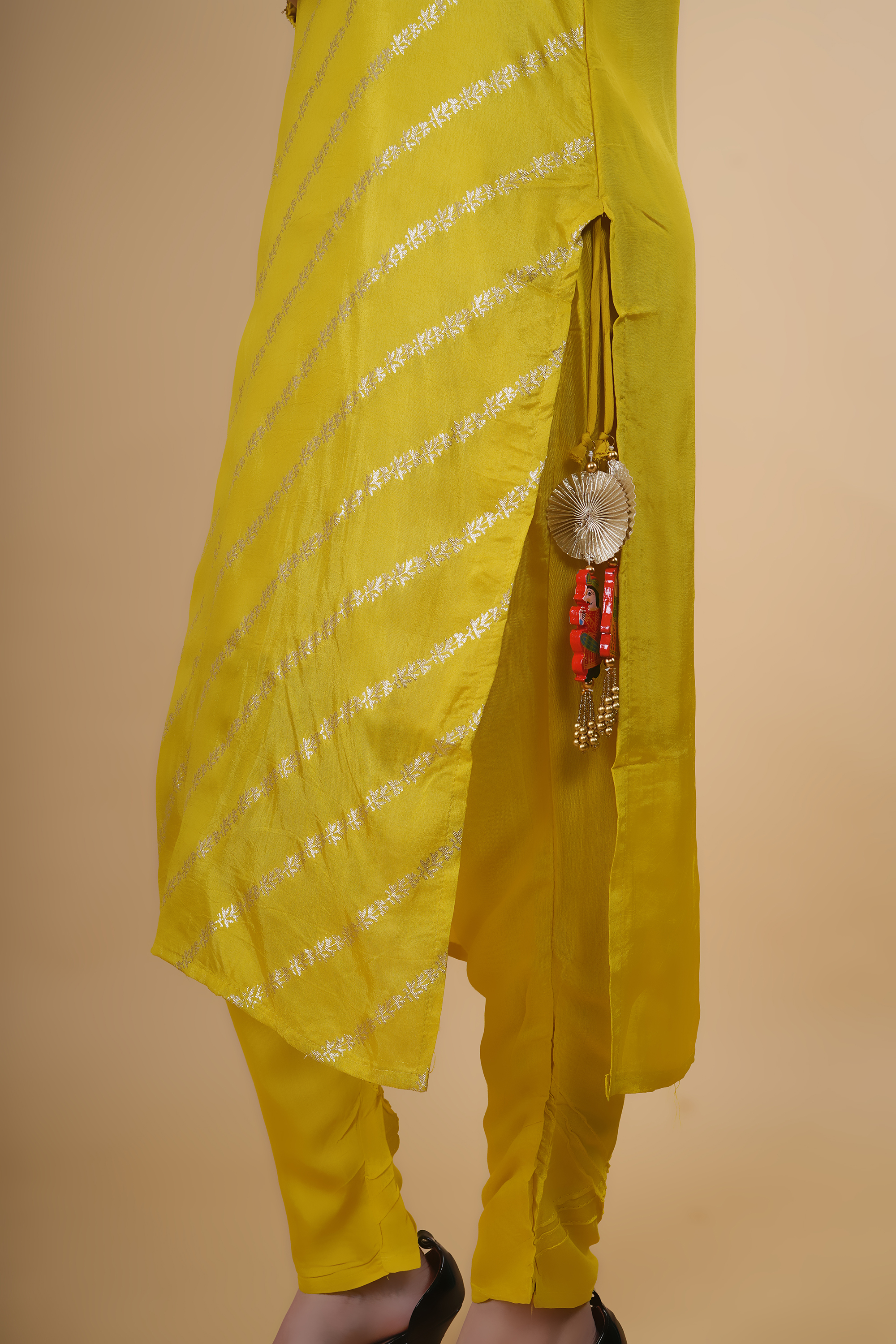 Lemon color suit with dupatta and tangles